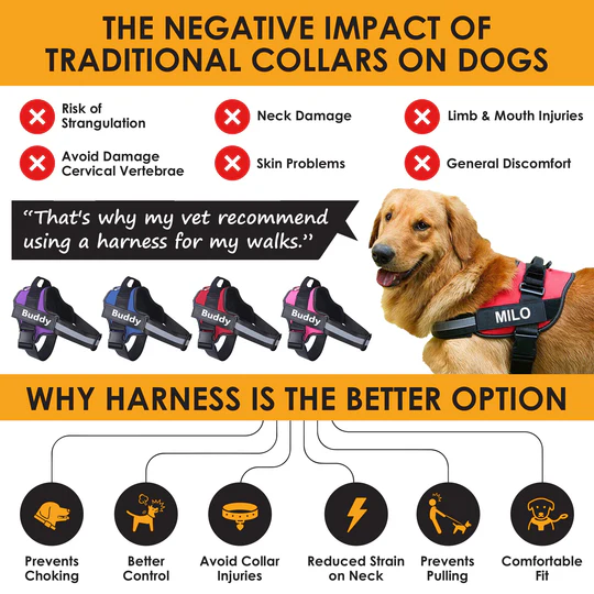 Traditional collars can put harmful pressure on your dog’s neck and spine — especially during sudden pulls. Our No-Pull Personalized Harness is designed to gently distribute pressure across the chest and shoulders, helping prevent injury to sensitive areas like the trachea and cervical spine. It’s a smarter, safer, and more thoughtful choice for the dog you love like family.